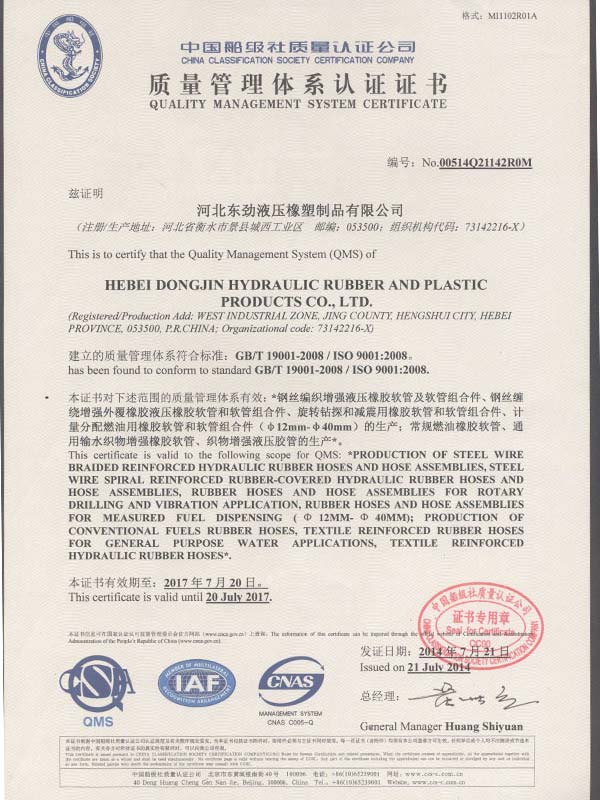 • 鋼絲編織管采用國際標準認可認可證書